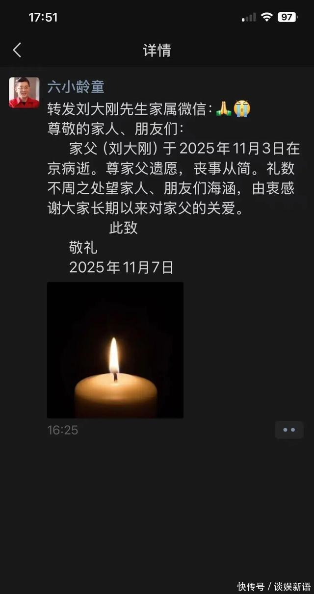 这事儿说起来有点唏嘘,一个在荧幕上默默挑担走了半辈子的“沙僧”,走的时候却轻得像一缕风。2025年11月3日,刘大刚在北京quietly走了,享年78岁。11月7日,戏曲圈的朋友刘冰在社交平台发了条消息,语气平静却压着沉甸甸的情绪——这位曾在《西游记续集》里扛着九环锡杖、一声不吭跟在师父身后的演员,真的走了。